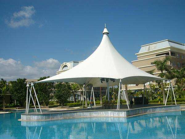 索膜结构是依靠膜自身的张拉应力与支撑杆和拉索共同构成机构体系。张拉膜结构特别适合用来建造城市标志性建筑的屋顶,如体育与娱乐性场馆,需有广告效应的商场、餐厅等。城市的交通枢纽是城市命脉的关键性建筑,使用功能要求建筑物各组成单元的标志明确。这类建筑越来越多采用膜结构。
