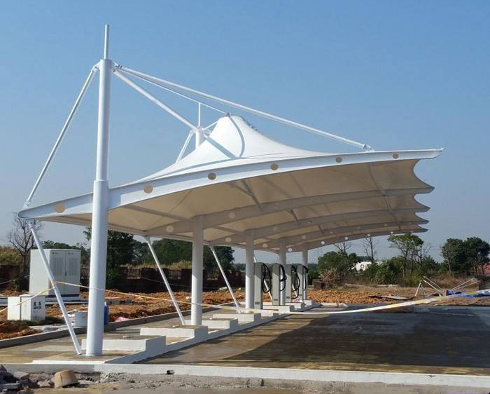 张拉膜结构车棚具有十分良好的承载性能,能以很小的厚度承受相当大的荷载。车棚的强度和刚度主要是利用了其几何形状的合理性,以材料直接受压来代替弯曲内力,从而充分发挥材料的潜力。因此车棚是一种强度高、刚度大、材料省的即经济又合理的结构形式。张拉膜结构停车棚已经融入到了我们的生活中,外观靓丽,实用性较高深得用户者们的喜爱,多种优点丰富便捷了我们的生活。